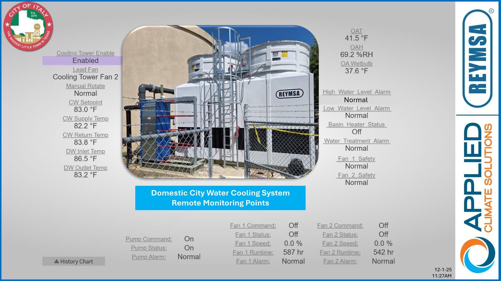 Applied Climate Solutions (ACS) delivered a fully integrated, single-source heat-rejection system for the City of Italy, Texas—covering system design, installation, preventive maintenance, repairs, water treatment, and remote monitoring with automated monthly reporting.